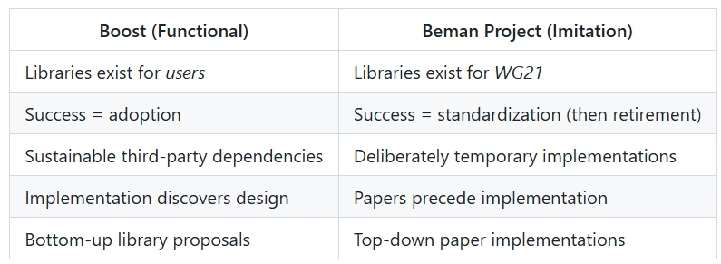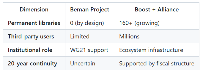 In 20 years, Boost will likely still exist, still serve users, still maintain libraries. The Beman Project will likely continue in some form, helping proposals through WG21. Both outcomes are fine—but they’re different in kind. Boost is infrastructure. The Beman Project is a pipeline.