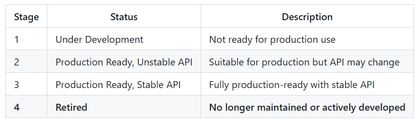 A library reaches Stage 4 (Retired) when the proposal is rejected, superseded, or—notably—integrated into the standard.