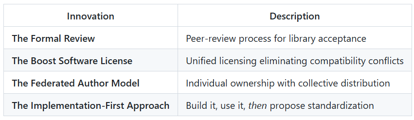 This style has merits: clear direction, defined outcomes, professional execution. But it contrasts with Boost’s historically organic, author-driven culture. The Beman Project reflects its leadership’s strengths—standardization expertise, committee relationships—rather than attempting to replicate Boost’s emergent dynamics.