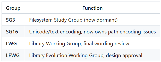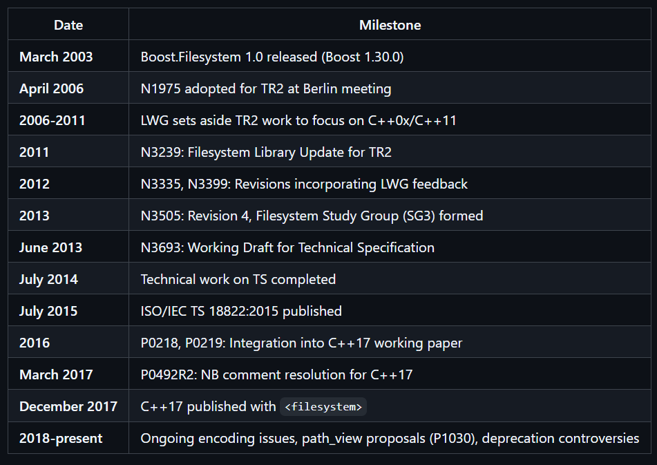 The process prioritized “not getting it wrong” over delivering value. By the time std::filesystem was standardized, the world had moved to UTF-8, but the encoding model reflected 2003 assumptions.