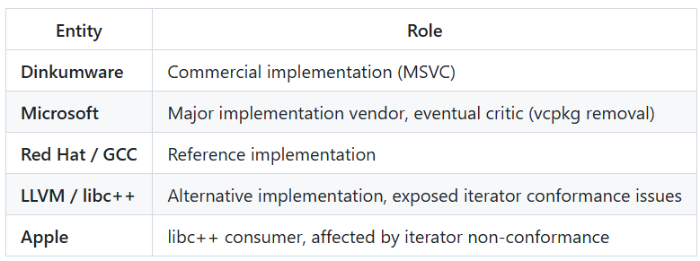 Common assessments of other C++ features—”ranges is mostly fine,” “modules are mostly fine,” “c++ is mostly fine”—reveals the institutional reality. The standard library is not broken, but it is also not healthy. Features ship with known deficiencies because: