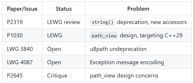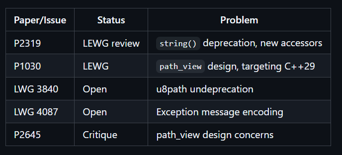 string()and adddisplay_string()path_view: Unlikely before C++29, possibly never if P2645’s concerns prevail