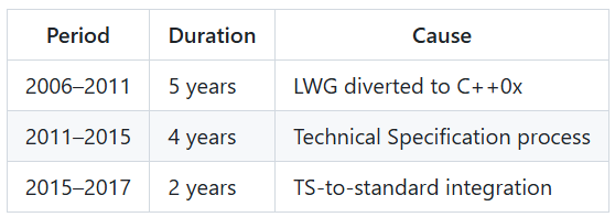 Process overhead: Fourteen years from Boost release to C++17 standardization