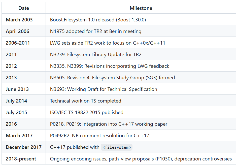 Had filesystem shipped in C++11 with its 2006 design, the encoding problems would have been discovered earlier, with more time to correct course before the committee’s momentum made changes difficult. The five-year pause for C++0x work created the worst outcome: a design frozen in 2006 assumptions, shipped in 2017 with those assumptions already obsolete.